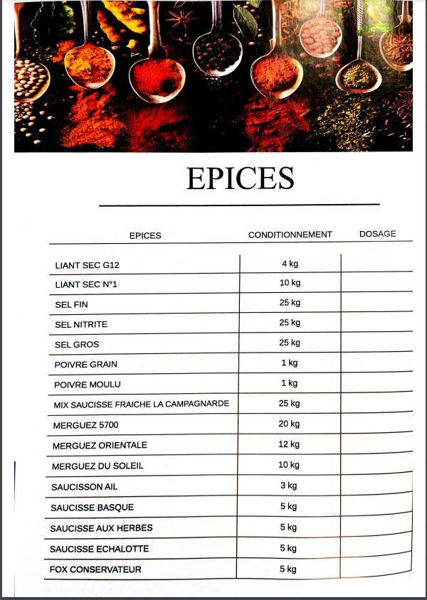 Découvrez notre sélection d’épices spécialement élaborées pour sublimer vos préparations en boucherie et charcuterie. Chaque mélange est minutieusement dosé pour révéler toute la richesse des saveurs et offrir une qualité exceptionnelle à vos viandes et charcuteries.